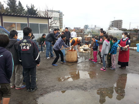 道場の前では保護者の皆さんにもご協力をいただき餅つきと豚汁づくり。全支部の生徒が集まり仲間との親睦を深めながら楽しくにぎやかに行います。子供たちの楽しい思い出になります。